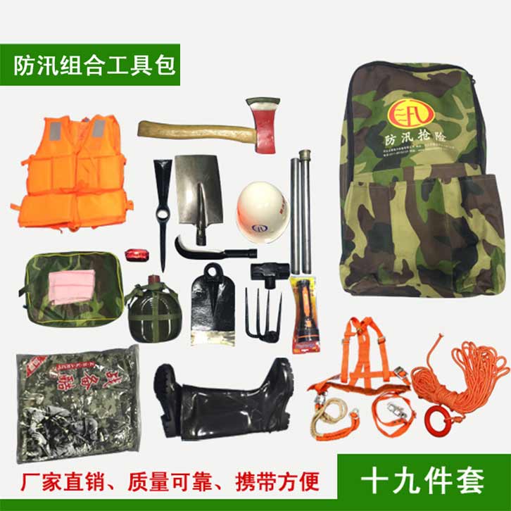 防汛組合工具包19件套:鎬、鈀、鋤頭、十磅錘、砍刀、方鏟、電筒、水鞋、防汛戰斗服、防寒雨衣、救生繩、雙背帶、救生衣、毛巾、水壺、頭盔、消防斧頭、信號燈、工具包。該組合工具包輕便、工具配備齊全適用于救援隊員使用。